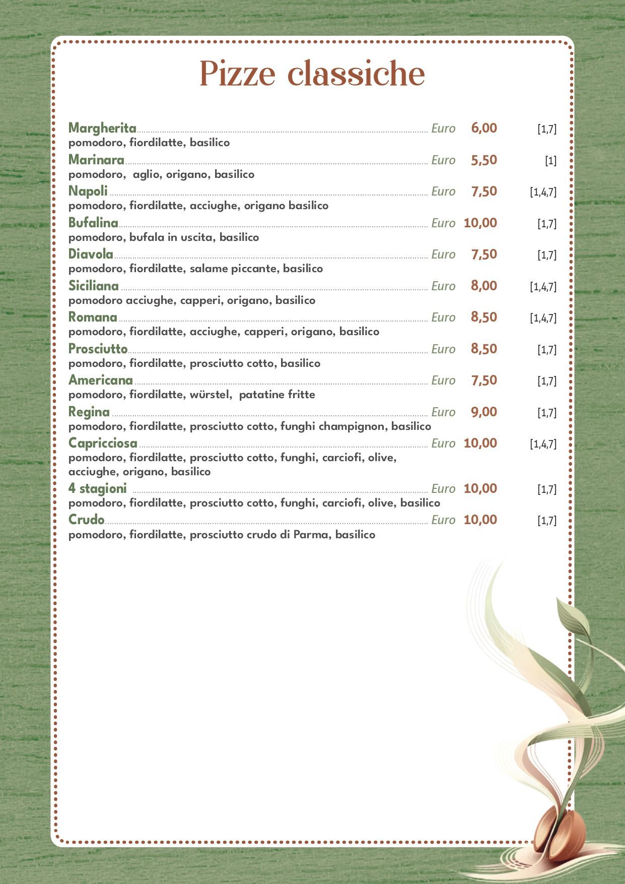 La pizzeria de Il Germoglio si distingue per la varietà e l’attenzione agli ingredienti, con un menu studiato per offrire alternative adatte a ogni preferenza. Le pizze vengono preparate al momento, con impasti curati e condimenti bilanciati, per garantire gusto e leggerezza.