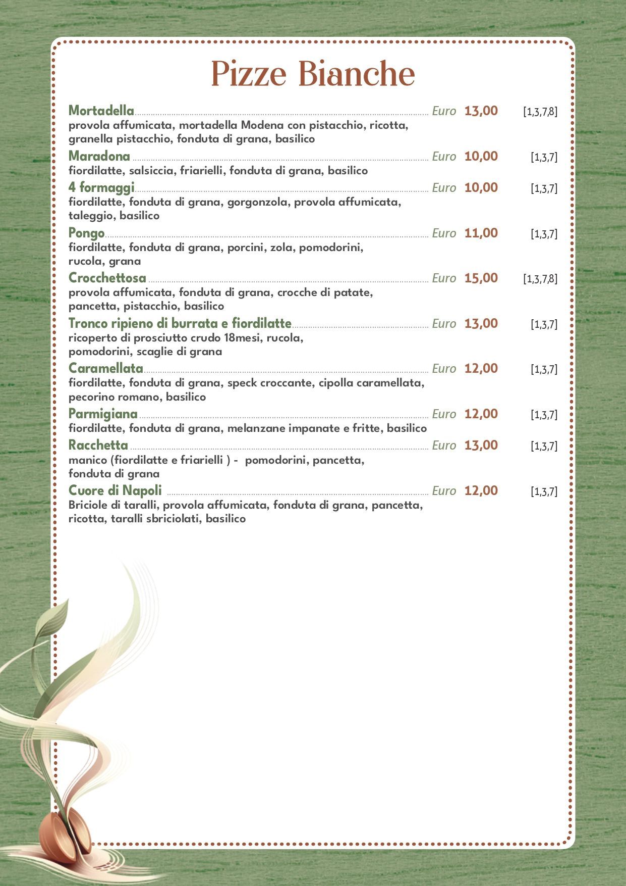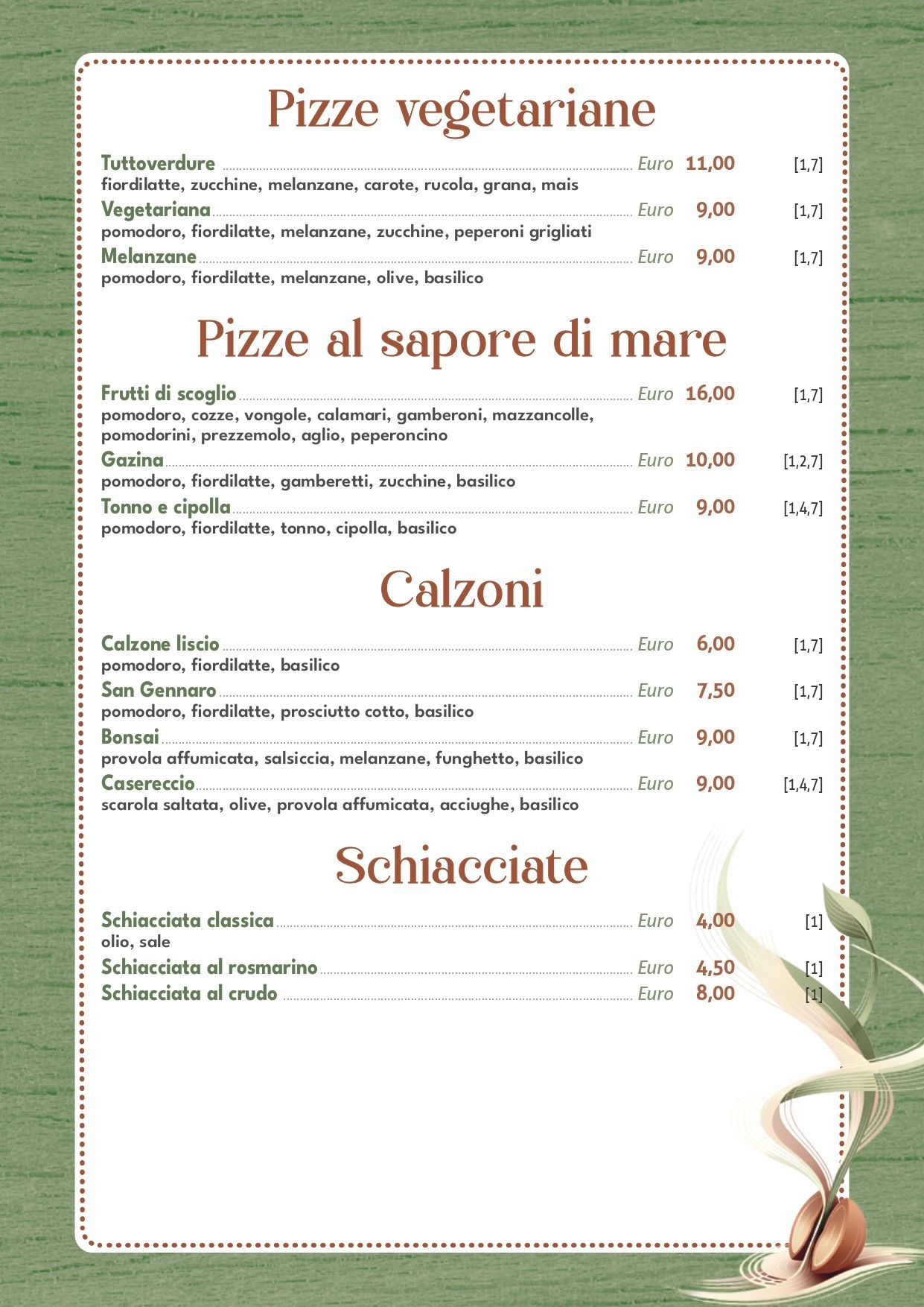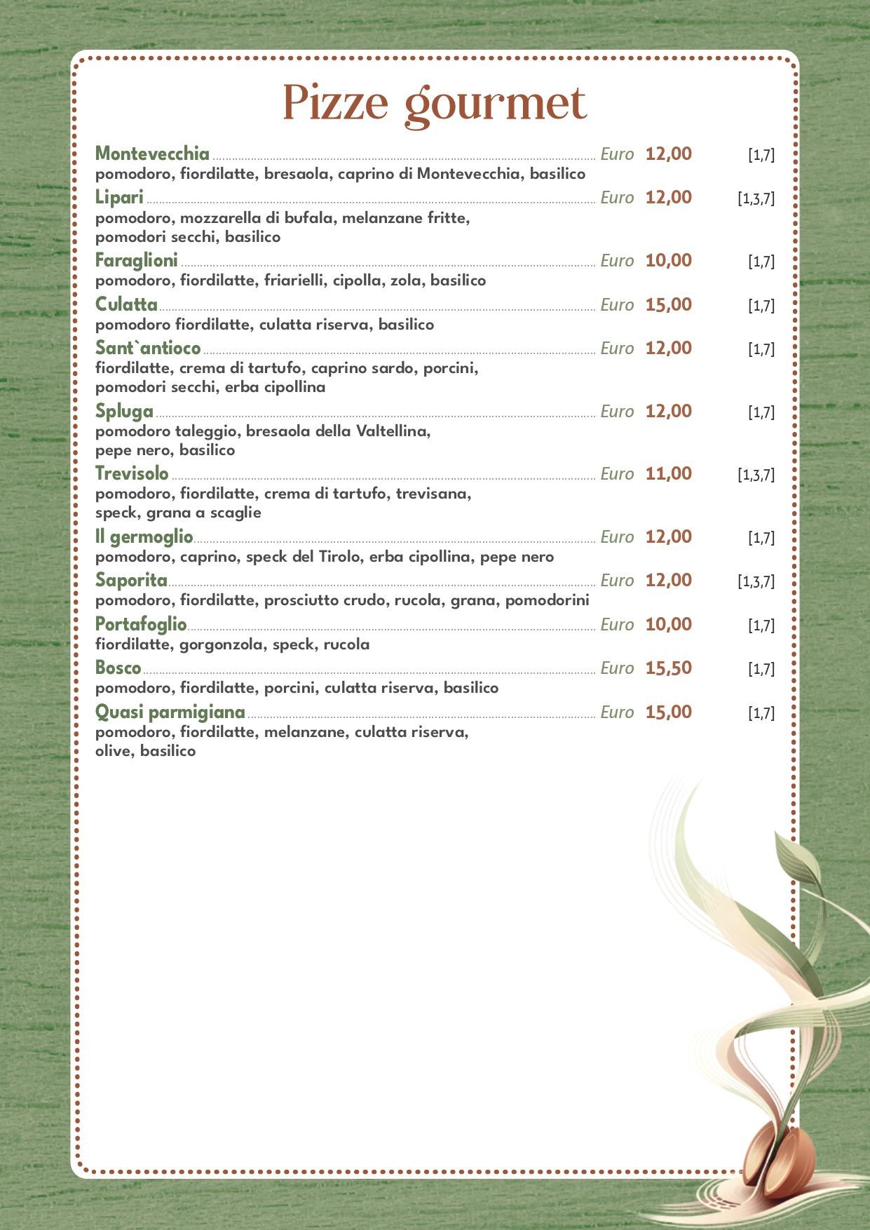 Il menu include diverse tipologie di pizze gourmet a Merate, affiancate alle classiche e alle varianti più creative. Dalle pizze rosse e bianche alle proposte vegetariane e di mare, fino a calzoni e schiacciate, l’offerta è pensata per soddisfare gusti diversi.