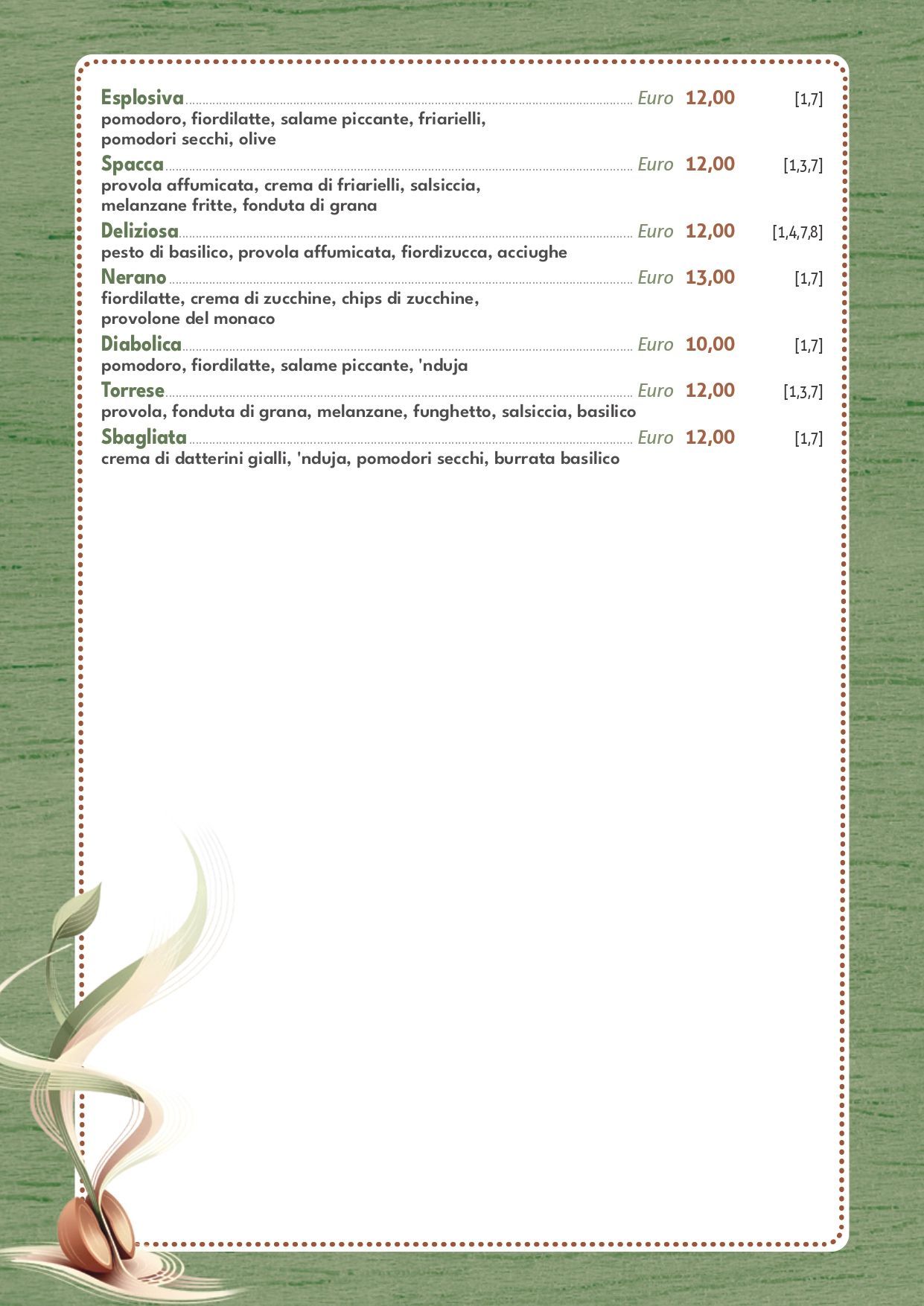 La pizzeria de Il Germoglio propone un’ampia scelta di pizze preparate con ingredienti selezionati e lavorazioni attente. Gli impasti disponibili includono classico, integrale, carbone vegetale e senza glutine, per adattarsi a diverse esigenze alimentari.
